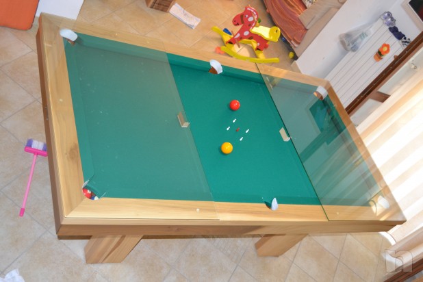 Vendo Tavolo da biliardo Etrusco modello TOP misure 210x120 tutto in legno massello chiaro (vedi foto)completo di 8 stecche ,palle italiana ed americana porta stecche segnapunti e triangolo in legno, scatola di gessetti nuova, spazzola e libretto regolamento giochi nonché copertura in vetro con tre lastre (una è rotta)per usarlo come tavolo da pranzo fino a dodici persone,usato poco e niente come nuovo!